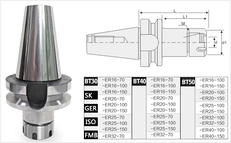 MAS BT 型 (簡稱 BT)BT 型是日本標準,安裝尺寸與 DIN 69871、IS0 7388/1 及ANSI 完全不同,不能換用。 BT型刀柄的對稱性結構使它比其它三種刀柄的高速穩定性要好。