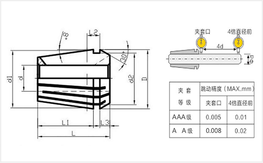 er20夾頭筒夾按照精度分,可分為A級,AA級,AAA級。A級的精度為:0.015mm以內,